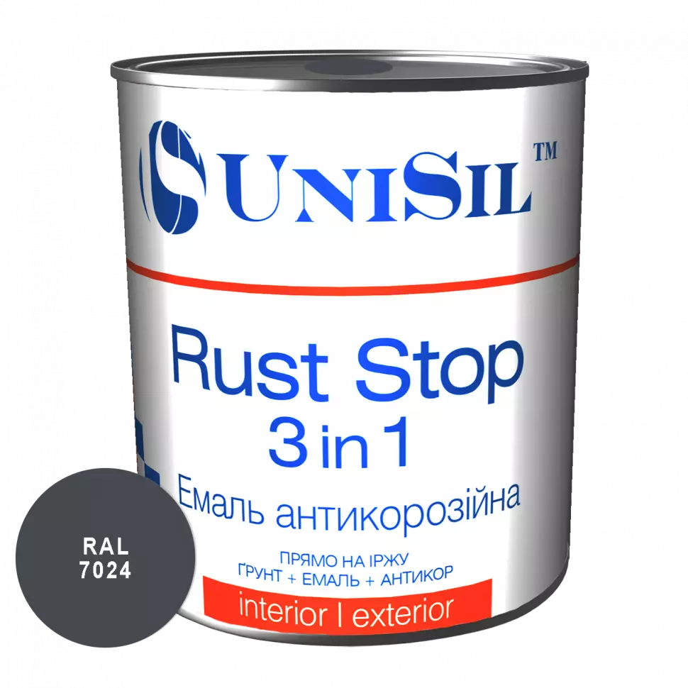 Емаль антикорозійна Unisil Rust Stop 3 in 1 розроблена спеціально для фарбування чистих і іржавих (товщина міцно пов'язаної іржі до 100 мкм) металевих поверхонь всередині і зовні приміщень.